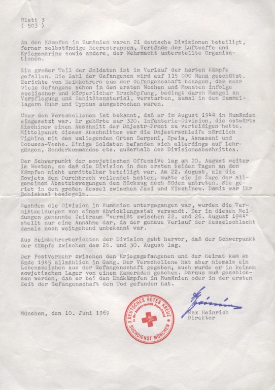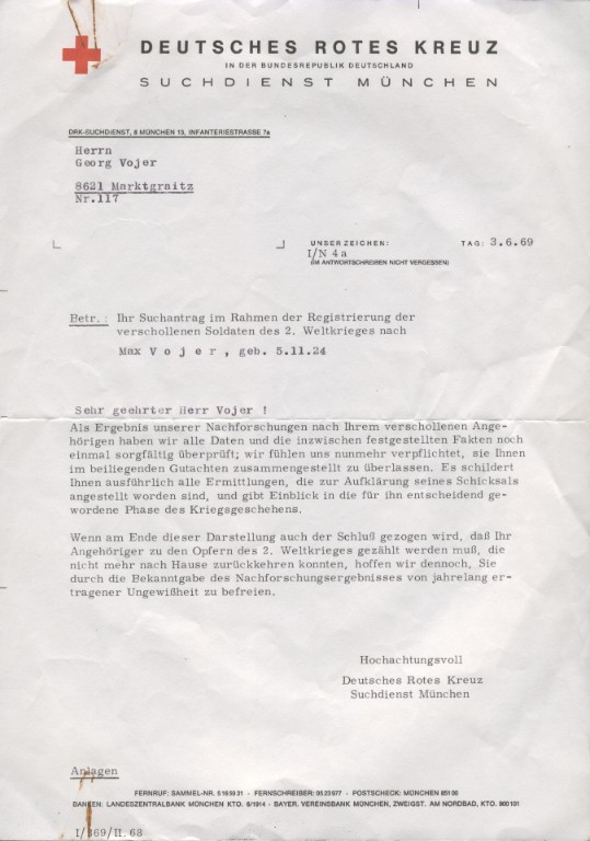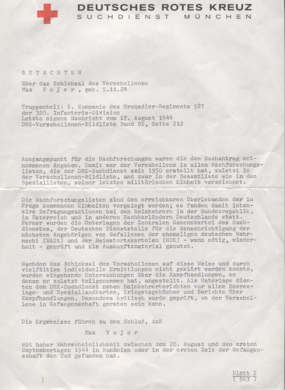 Gutachen des DRK-Suchdienstes über das Schicksal des seit 1944 verschollenen Sohnes Max Vojer