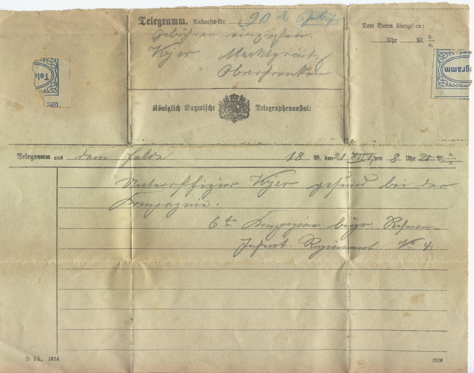 Telegramm aus dem Feld vom 21.12.1917: "Unteroffizier Vojer gesund bei der Kompanie."