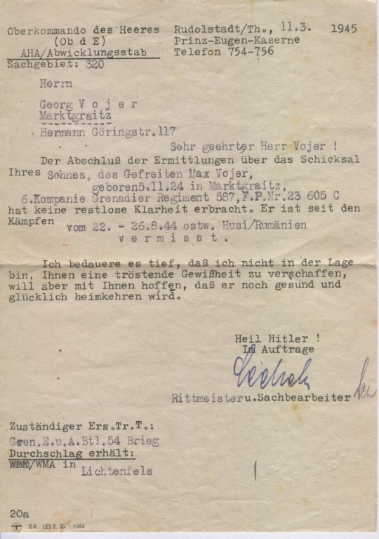 Vermisstenmeldung über den Gefreiten Max Vojer vom 11. März 1945